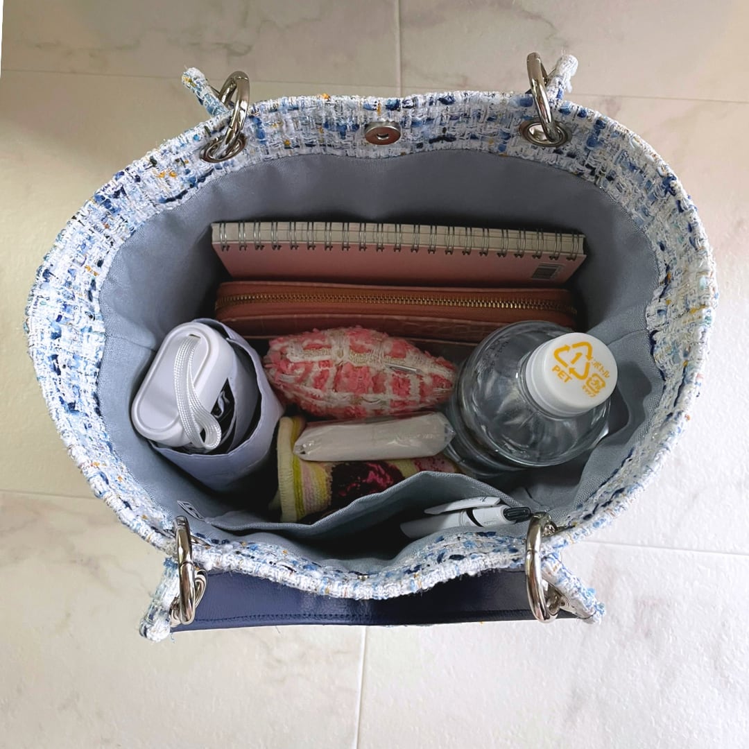 持ち手の内側と底面にハリのある合皮ネイビーで上品にまとまります